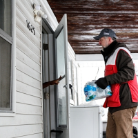 A man delivers bottled water to a Flint resident (photo: Sarah Rice, Getty Images)