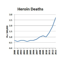 In 2010, there were 3,036 deaths in the United States involving heroin overdoses, a rate of 1.0 per 100,000 population. By 2013, the number had jumped to 8,257, a rate of 2.7 per 100,000.
