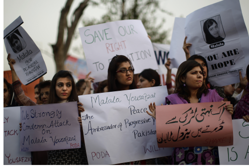 Pakistani women hold banners during a protest condemning the attack on schoolgirl Malala Yousufzai, in Islamabad, Pakistan, Wednesday, Oct. 10, 2012. Pakistani doctors successfully removed a bullet from the neck of the14-year-old girl who was shot by the Taliban for speaking out in support of education for women. Banner bottom right reads, " The Taliban is afraid of an unarmed girl." Yousufzai was flown to the United Kingdom for treatment on October 15. (AP Photo/Muhammed Muheisen)